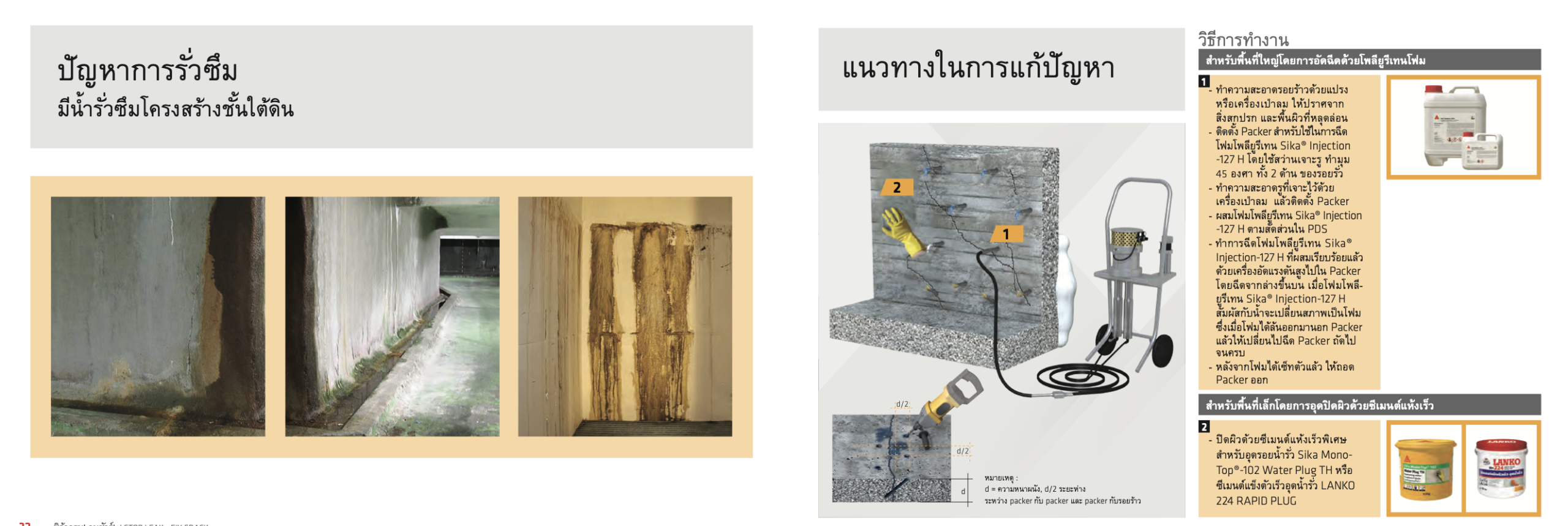 น้ำยาอัดฉีดประเภท โพลียูรีเทนโฟม (PU Foam Injection) ชนิดไม่ชอบน้ำ ที่ทำปฏิกิริยากับน้ำแล้วจะขยายตัวเป็นโฟมเพื่อ หยุดการรั่วซึมของน้ำ